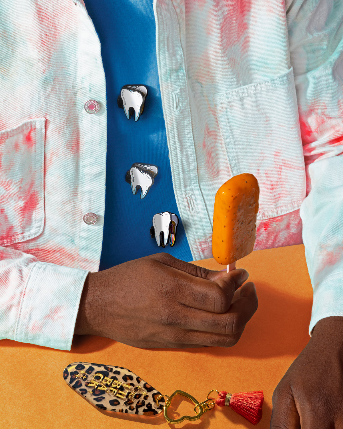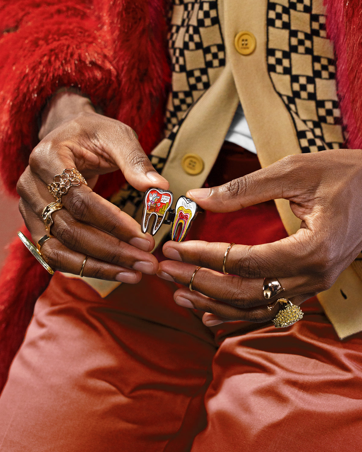 TOOTH FAIRY by serious about — a tooth-shaped pin that opens up to reveal the not-so-sweet truth. On the outside — innocent and pearly, on the inside — an exhausted fairy counting cash and a tooth cross-section to remind you: beauty always has a price.