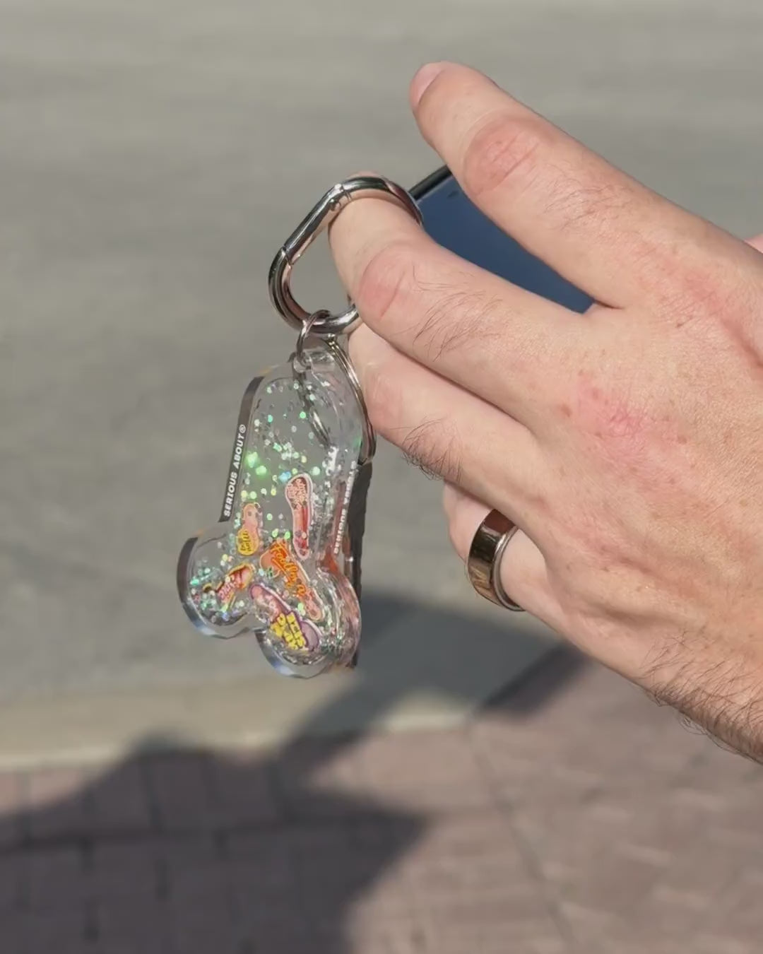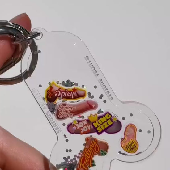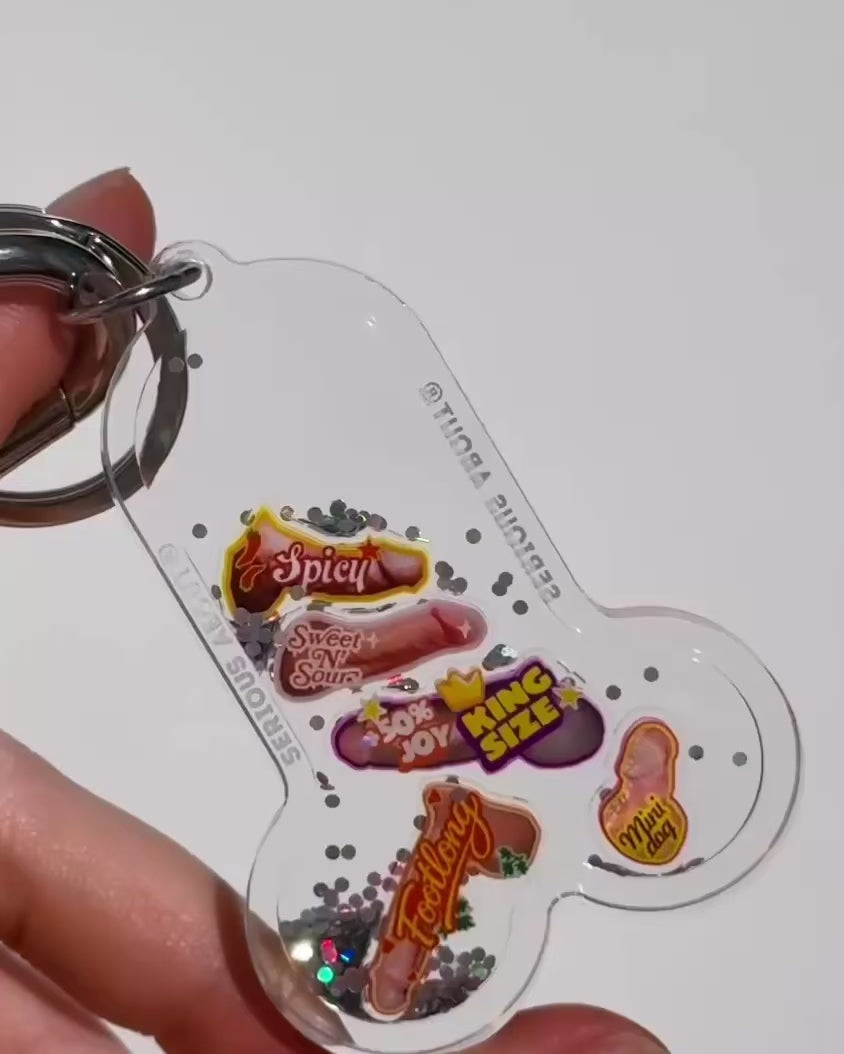 Yes, those are little… hot dogs. Five of them. Floating around in glitter, living their best life. A bit wrong. A bit funny. Way too satisfying to shake. If you get it — you get it. If not… it’s just a keychain, right?