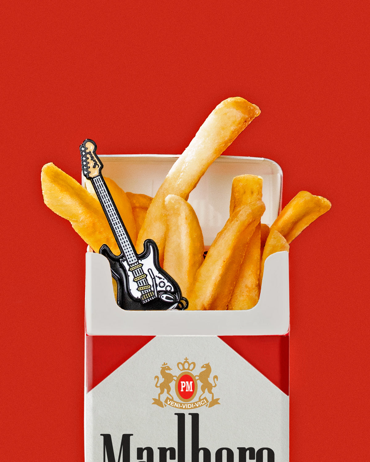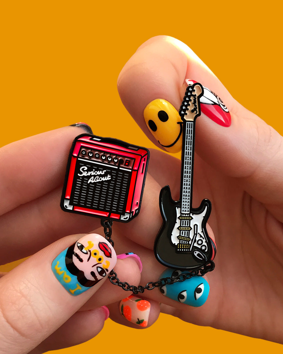 GUITAR COMBO BLACK — two metal pins, a guitar and an amp, connected by a chain like the eternal duo of inspiration and rhythm. A mini combo for those who can hear music even in the silence of boring conversations.