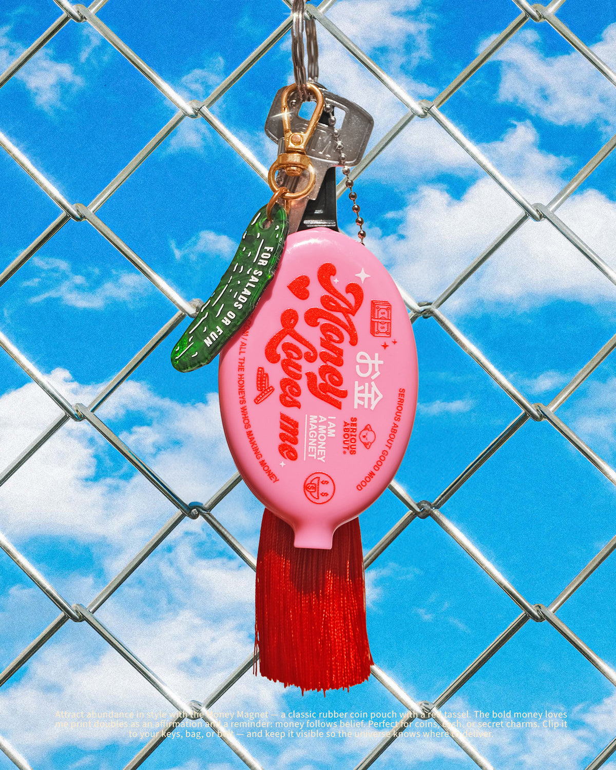 Attract abundance in style with the Money Magnet — a classic rubber coin pouch with a red tassel. The bold money loves me print doubles as an affirmation and a reminder: money follows belief. Perfect for coins, cash, or secret charms. Clip it to your keys, bag, or belt — and keep it visible so the universe knows where to deliver.
